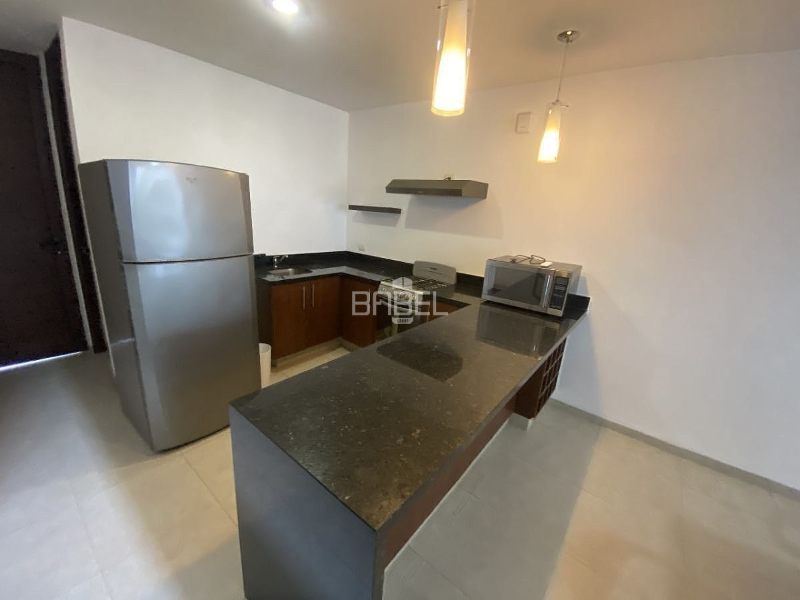 - Cocina equipada, con refrigerador, estufa y microondas