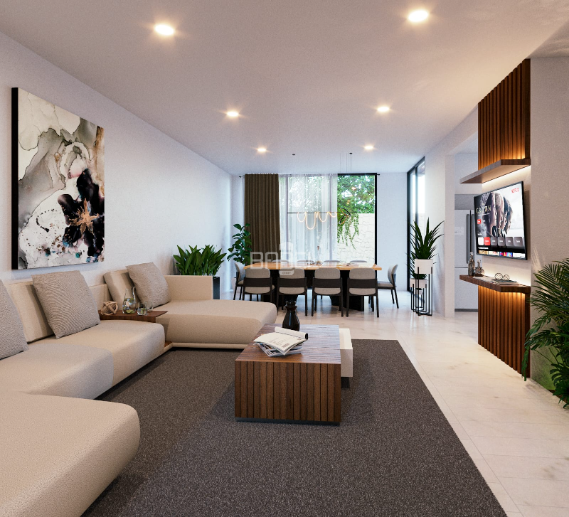 - Sala comedor con jardín interior con acceso directo a terraza y vista a la alberca
